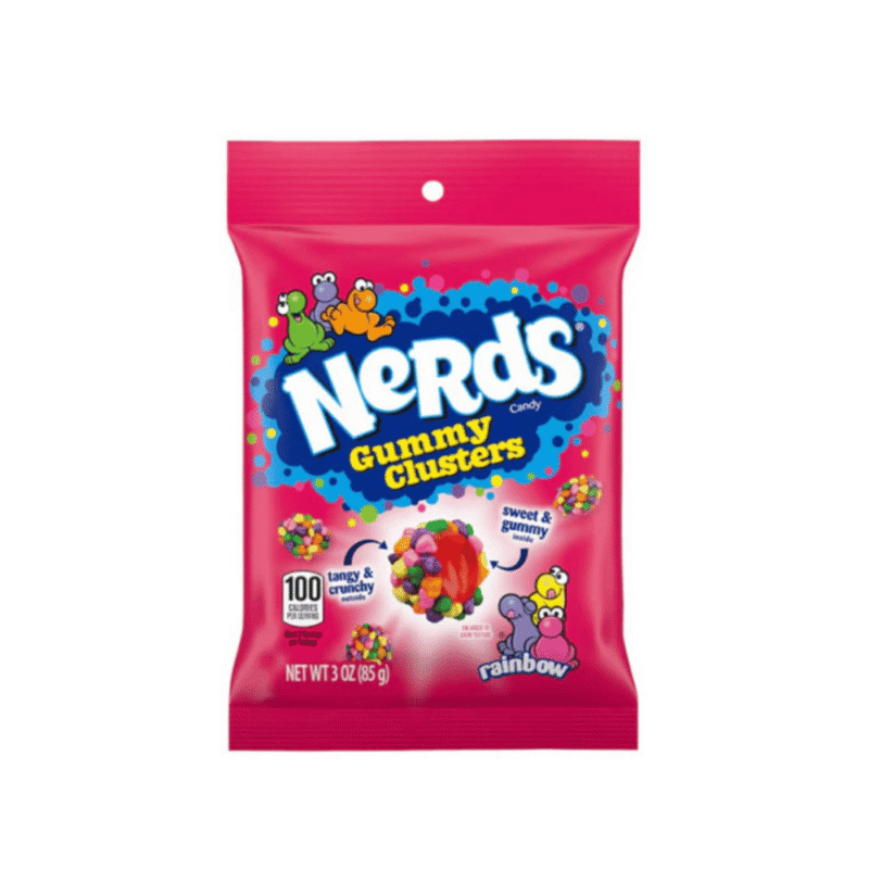 Get the best of both worlds with Nerds Gummy Clusters Rainbow – a wildly fun candy that combines crunchy, fruity Nerds on the outside and a soft, chewy gummy centre on the inside. This colourful mix delivers a playful bite-sized treat packed with texture and tangy sweetness.